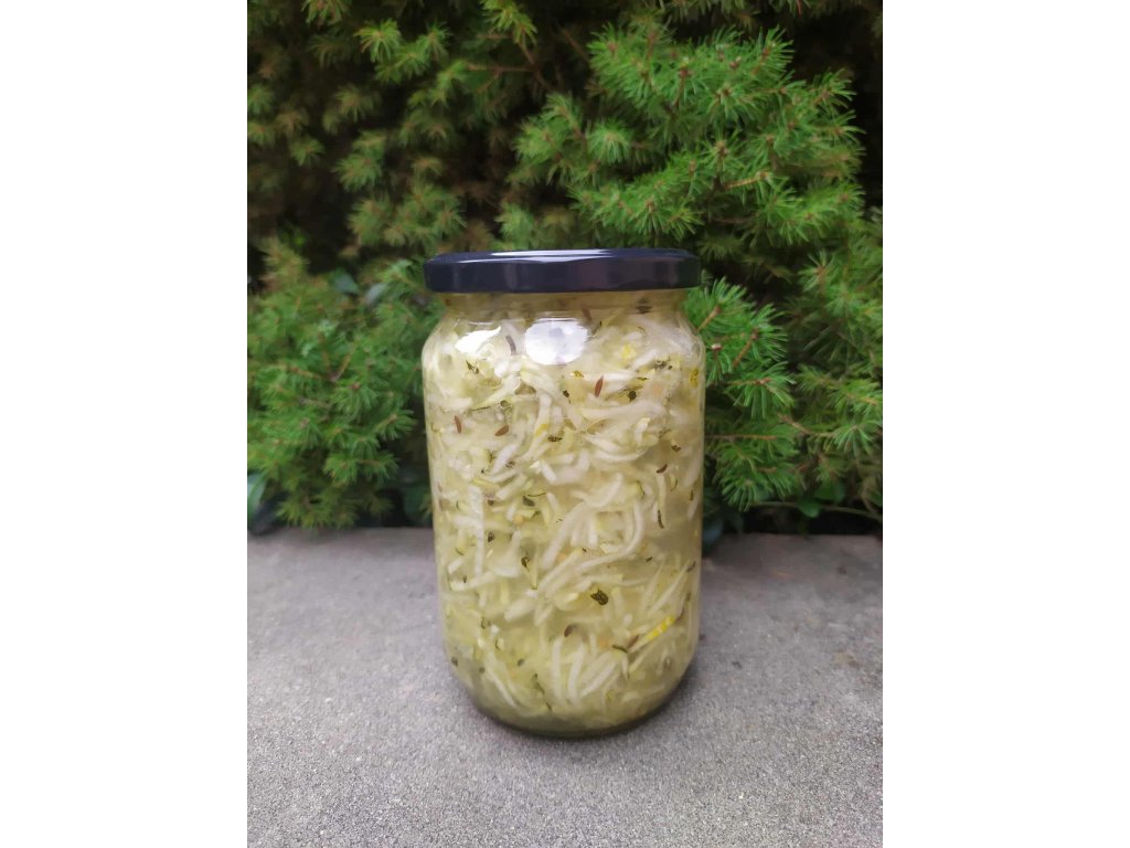 Jemně nastrouhaná cuketa s přídavkem octa a klasického koření získává charakteristickou nakyslou chuť a křupavost. Receptura inspirovaná tradičním kysaným zelím vytváří osvěžující přílohu doplňující hlavní jídla nebo obohatí studené mísy.