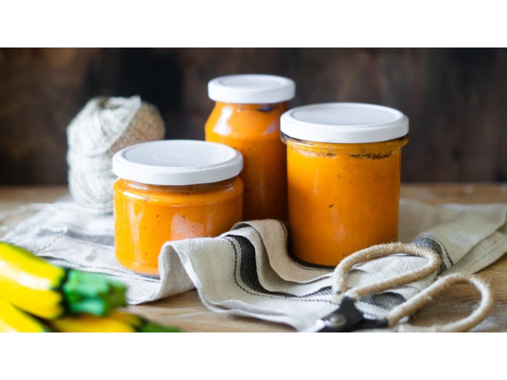 Složení: cuketa, rajčata, cibule, sádlo, česnek, cukr, ocet kvasný lihový, nové koření, pepř, bobkový list