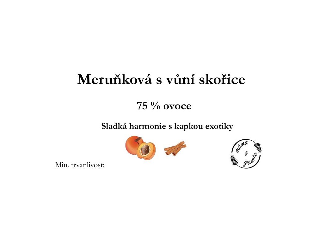 Složení: 75 % meruňky, cukr, citrusový pektin (želírovací látka), skořice mletá 0,3%