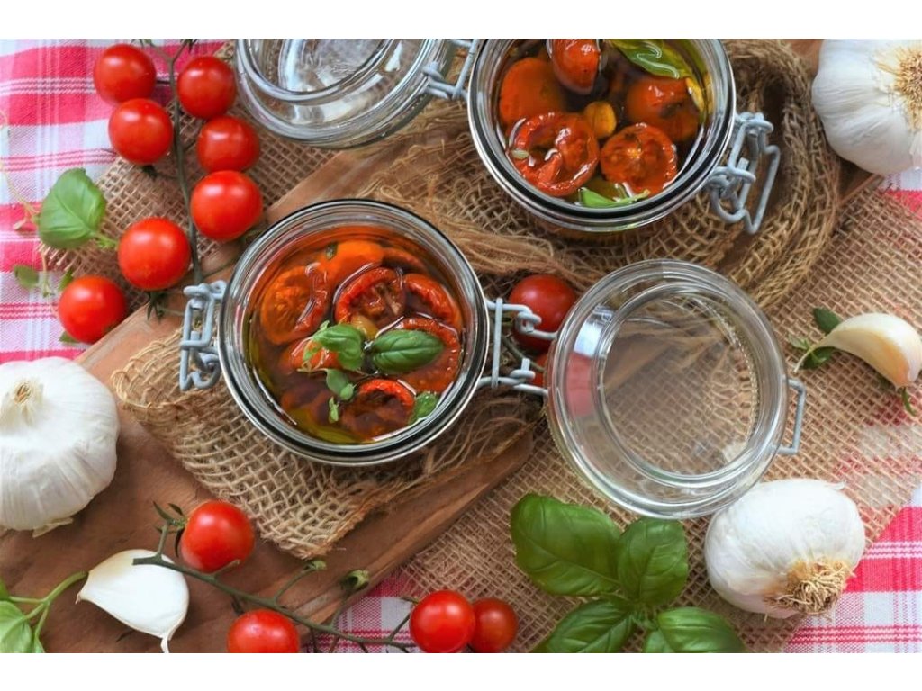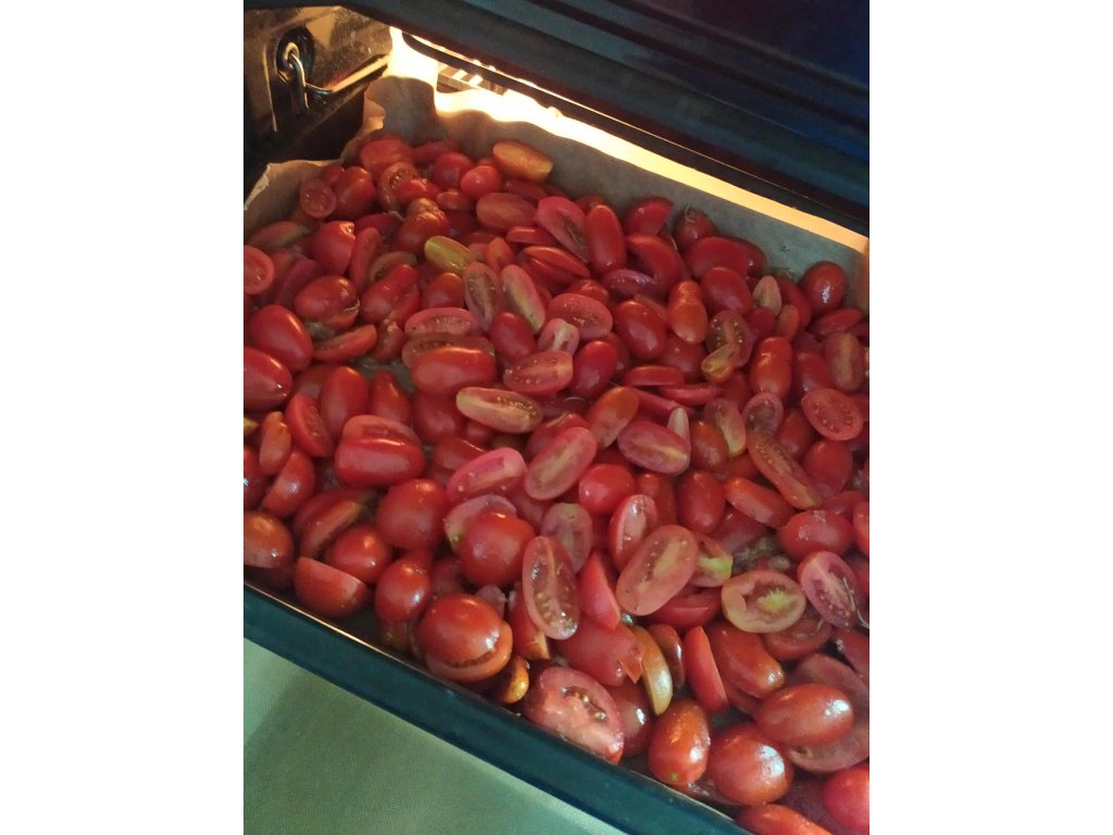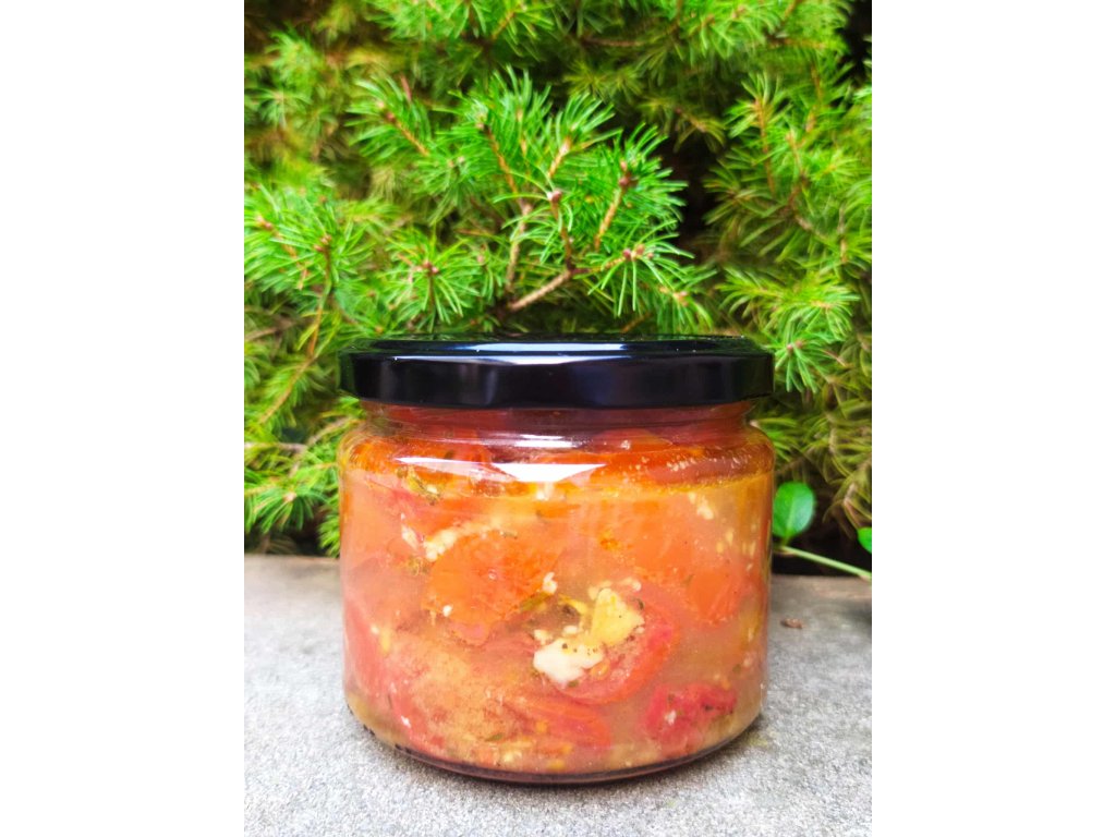 Šťavnatá rajčata, pomalu pečená v troubě, aby se jejich chuť dokonale zkoncentrovala. Ovoněná česnekem a voňavými bylinkami – jako kdyby právě vyšla z babiččiny zahrádky.