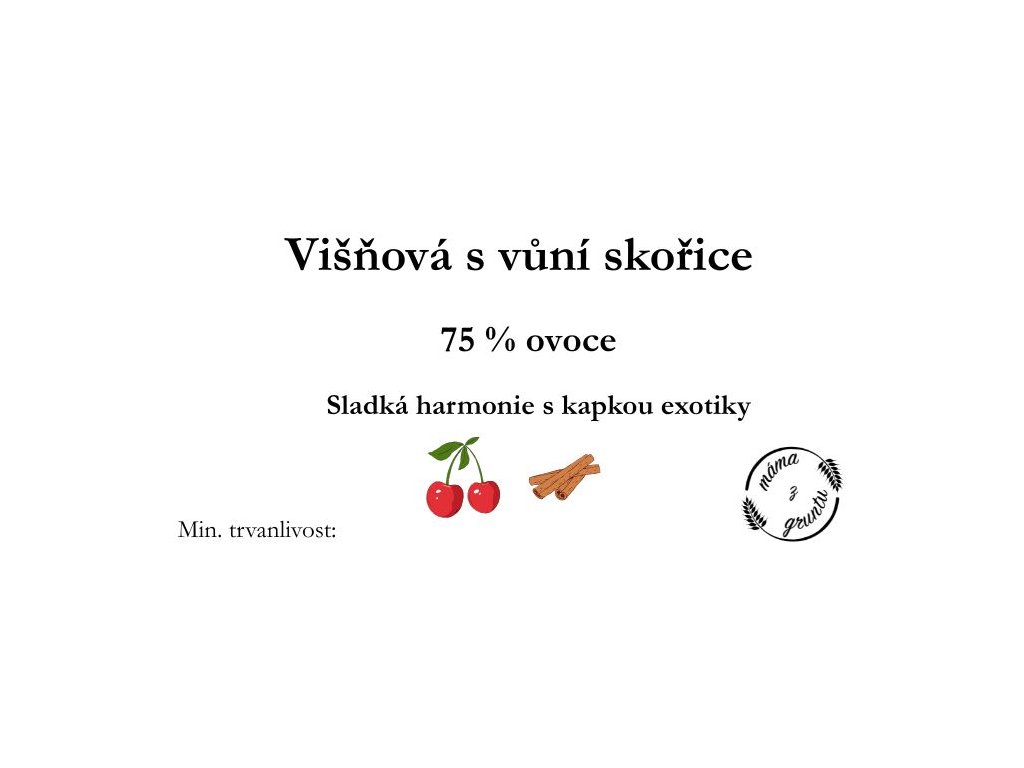 Složení: 75 % višně, cukr, citronová šťáva, citrusový pektin (želírovací látka), skořice mletá 0,1%